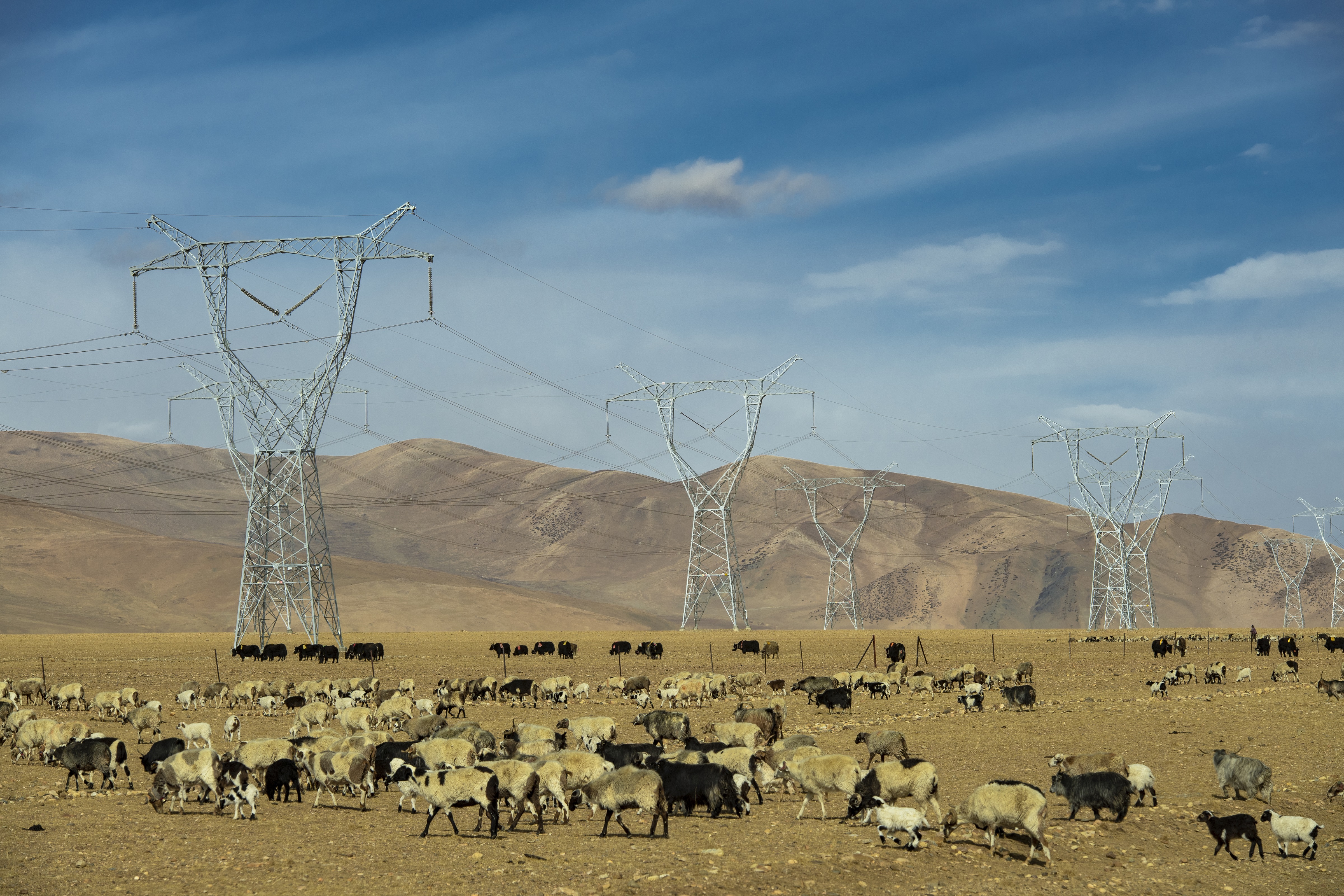 2023年5月,在薩嘎縣公珠措景區(qū)旁,110千伏隆門線佇立在高原之上,電力鐵塔下是一群覓食的牛羊,構(gòu)成了一幅電力與大自然和諧共處的畫面。