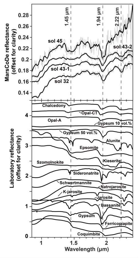 劉洋研究員和合作者通過對祝融號火星表面成分探測器獲取的短波紅外光譜和導(dǎo)航與地形相機數(shù)據(jù)進(jìn)行分析,發(fā)現(xiàn)了一種形貌上類似沉積巖的巖石類型——板狀的亮色巖石。這些板狀巖石通常部分被灰塵和土壤覆蓋,顯示出剝落的表面,表明受到熱應(yīng)力和風(fēng)成作用的物理風(fēng)化。研究人員利用短波紅外光譜在這些亮色板狀巖石中探測到了之前軌道數(shù)據(jù)在該區(qū)域沒有識別到的含水礦物,這些光譜具有~1.9μm和~2.2μm吸收特征,推測其為含水硅或含水硫酸鹽。