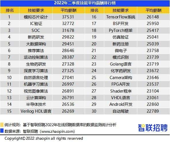 對(duì)于技術(shù)性強(qiáng)的職業(yè),有時(shí)技能要求甚至比學(xué)歷要求更重要,掌握其關(guān)鍵技能成為獲取高薪的關(guān)鍵。二季度高薪技能榜中,芯片設(shè)計(jì)、新藥研發(fā)、大數(shù)據(jù)架構(gòu)、算法等穩(wěn)居前位。模擬芯片設(shè)計(jì)以37531元的平均月薪位居首位,IC驗(yàn)證、SOC技能的薪資水平也較高。