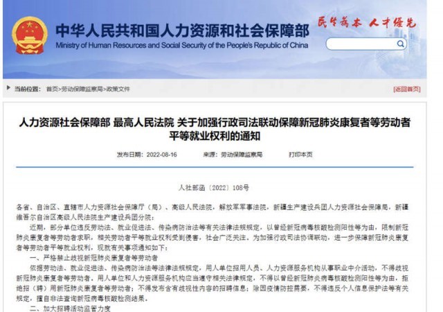 中國青年報(bào)客戶端北京8月16日電(中青報(bào)·中青網(wǎng)記者 李桂杰)人力資源和社會保障部、最高人民法院今天發(fā)布《關(guān)于加強(qiáng)行政司法聯(lián)動保障新冠肺炎康復(fù)者等勞動者平等就業(yè)權(quán)利的通知》(以下簡稱《通知》),再次重申嚴(yán)格禁止歧視新冠肺炎康復(fù)者等勞動者,并就加強(qiáng)就業(yè)歧視案件審理工作作出部署。