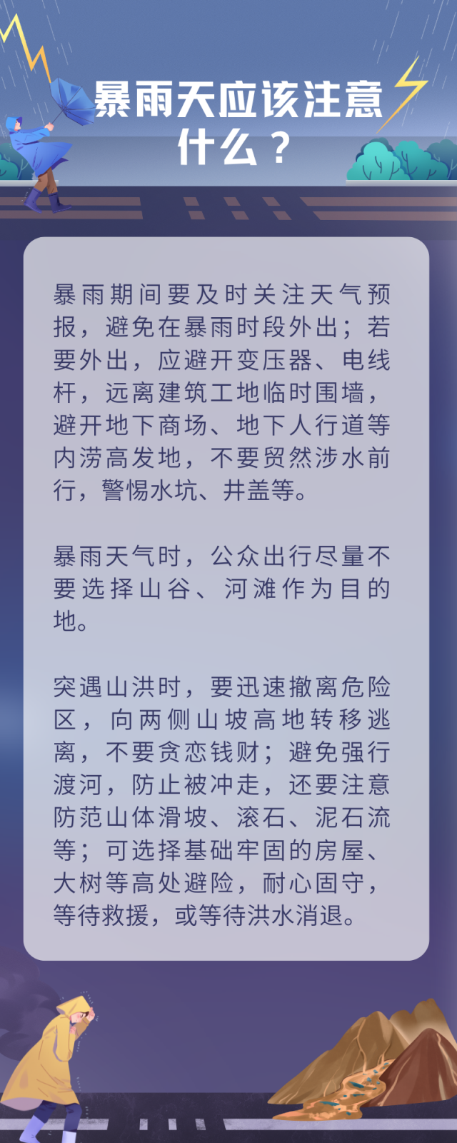 暴雨天應(yīng)該注意什么?業(yè)內(nèi)專家建議,暴雨期間要及時關(guān)注天氣預(yù)報,避免在暴雨時段外出;若要外出,應(yīng)避開變壓器、電線桿,遠離建筑工地臨時圍墻,避開地下商場、地下人行道等內(nèi)澇高發(fā)地,不要貿(mào)然涉水前行,警惕水坑、井蓋等。