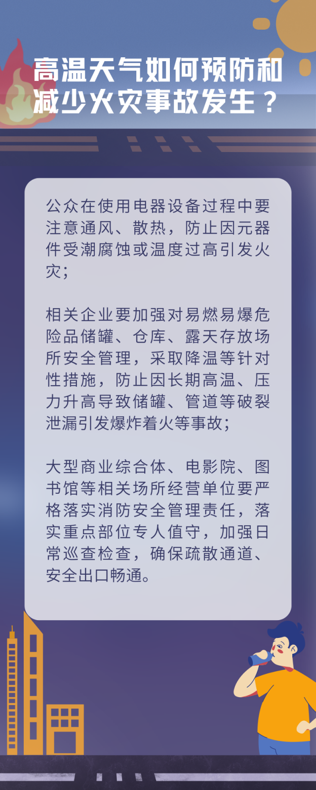高溫天氣如何有效預(yù)防和減少火災(zāi)事故發(fā)生?應(yīng)急管理部消防救援局發(fā)布消防安全提示,公眾在使用電器設(shè)備過程中要注意通風(fēng)、散熱,防止因元器件受潮腐蝕或溫度過高引發(fā)火災(zāi);相關(guān)企業(yè)要加強對易燃易爆危險品儲罐、倉庫、露天存放場所安全管理,采取降溫等針對性措施,防止因長期高溫、壓力升高導(dǎo)致儲罐、管道等破裂泄漏引發(fā)爆炸著火等事故;大型商業(yè)綜合體、電影院、圖書館等相關(guān)場所經(jīng)營單位要嚴格落實消防安全管理責(zé)任,落實重點部位專人值守,加強日常巡查檢查,確保疏散通道、安全出口暢通。