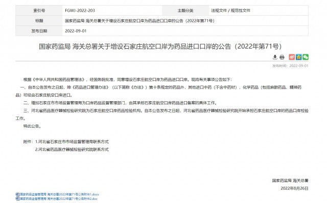 央視網(wǎng)消息:據(jù)國家藥監(jiān)局網(wǎng)站9月1日消息,國家藥監(jiān)局、海關(guān)總署發(fā)布關(guān)于增設(shè)石家莊航空口岸為藥品進(jìn)口口岸的公告。