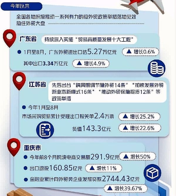 跨境電商等新業(yè)態(tài)也成為穩(wěn)外貿(mào)的重要力量。今年,重慶成功舉辦了跨境電商交易會(huì),積極推動(dòng)跨境電商“保稅進(jìn)口+零售分裝”業(yè)務(wù)試點(diǎn),推廣“跨境電商+產(chǎn)業(yè)帶”模式,為外貿(mào)企業(yè)穩(wěn)訂單、拓市場(chǎng)提供了新的解決方案。今年前8個(gè)月,重慶跨境電商交易額達(dá)291.9億元,增長(zhǎng)50%。