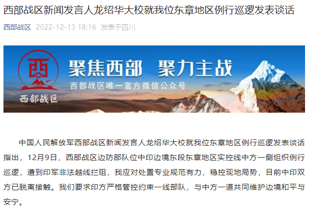中國人民解放軍西部戰(zhàn)區(qū)新聞發(fā)言人龍紹華大校就我位東章地區(qū)例行巡邏發(fā)表談話指出,12月9日,西部戰(zhàn)區(qū)邊防部隊(duì)位中印邊境東段東章地區(qū)實(shí)控線中方一側(cè)組織例行巡邏,遭到印軍非法越線攔阻,我應(yīng)對處置專業(yè)規(guī)范有力,穩(wěn)控現(xiàn)地局勢,目前中印雙方已脫離接觸。我們要求印方嚴(yán)格管控約束一線部隊(duì),與中方一道共同維護(hù)邊境和平與安寧。