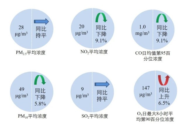 1—11月,全國339個(gè)地級(jí)及以上城市平均空氣質(zhì)量優(yōu)良天數(shù)比例為86.8%,同比下降0.8個(gè)百分點(diǎn);PM2.5平均濃度為28微克/立方米,同比持平;PM10平均濃度為49微克/立方米,同比下降5.8%;O3平均濃度為147微克/立方米,同比上升6.5%;SO2平均濃度為9微克/立方米,同比持平;NO2平均濃度為20微克/立方米,同比下降9.1%;CO平均濃度為1.0毫克/立方米,同比下降9.1%。