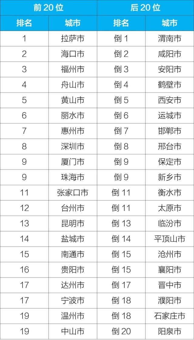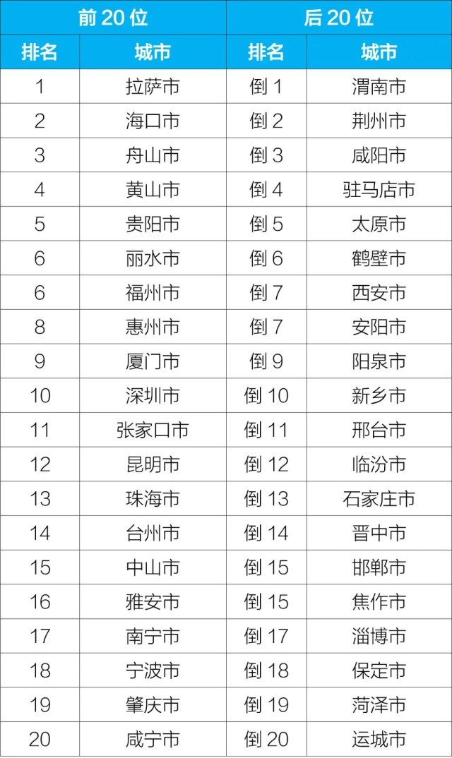 1—11月,168個(gè)重點(diǎn)城市中,拉薩、??诤椭凵绞械瘸鞘锌諝赓|(zhì)量相對(duì)較好(從第1名至第20名);渭南、荊州和咸陽市等城市空氣質(zhì)量相對(duì)較差(從倒數(shù)第1名至倒數(shù)第20名),見附表2。