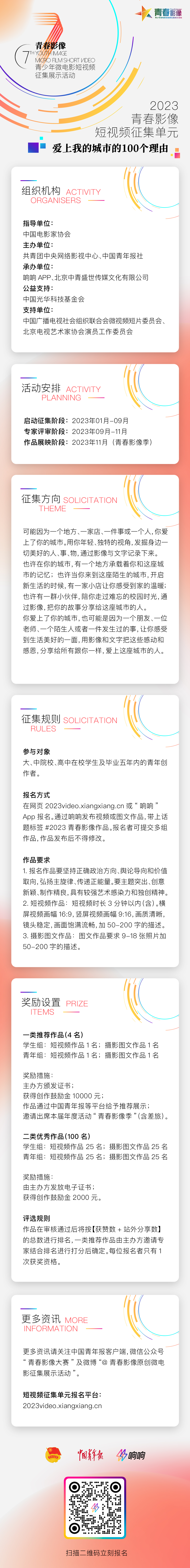 2022年12月31日,在中國電影家協(xié)會的指導下,由共青團中央網(wǎng)絡影視中心、中國青年報社、珠海奇妙科技有限公司等單位組織開展的第七屆青春影像——“愛上我的城市的100個理由”短視頻征集單元正式啟動!