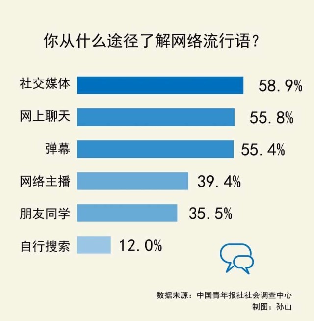 網(wǎng)絡(luò)流行語因生動活潑的特點,受到年輕人的喜愛,但不分場合地過度使用網(wǎng)絡(luò)流行語,也會帶來負面影響。近日,中國青年報社社會調(diào)查中心聯(lián)合問卷網(wǎng)(wenjuan.com),對1217名受訪青年進行的一項調(diào)查顯示,社交媒體是受訪青年了解網(wǎng)絡(luò)流行語的主要途徑,61.5%的受訪青年認為過度使用網(wǎng)絡(luò)流行語會在一定程度上沖擊傳統(tǒng)語言文化。