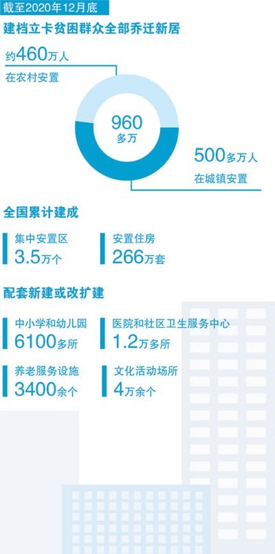 習(xí)近平總書記強(qiáng)調(diào):“易地搬遷是解決一方水土養(yǎng)不好一方人、實(shí)現(xiàn)貧困群眾跨越式發(fā)展的根本途徑,也是打贏脫貧攻堅(jiān)戰(zhàn)的重要途徑?!秉h的十八大以來(lái),全國(guó)累計(jì)建成集中安置區(qū)3.5萬(wàn)個(gè)、安置住房266萬(wàn)套。到2020年底,全國(guó)易地扶貧搬遷規(guī)劃建設(shè)任務(wù)全面完成,近千萬(wàn)生活在“一方水土難養(yǎng)一方人”地方的建檔立卡貧困人口實(shí)現(xiàn)易地扶貧搬遷,搬入新家園、開(kāi)啟新生活。