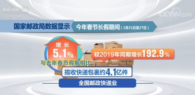 國家郵政局?jǐn)?shù)據(jù)顯示,今年春節(jié)長假期間(1月21日至27日),全國郵政快遞業(yè)攬收快遞包裹約4.1億件,與去年春節(jié)假期相比增長5.1%,較2019年同期增長192.9%;投遞快遞包裹3.3億件,與去年春節(jié)假期相比增長10.0%,較2019年同期增長254.8%。