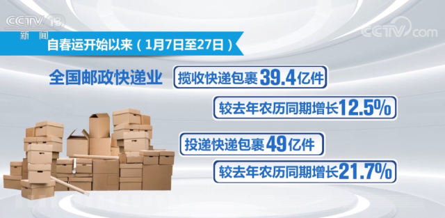數(shù)據(jù)顯示,自春運(yùn)開始以來(1月7日至27日),全國郵政快遞業(yè)攬收快遞包裹39.4億件,較去年農(nóng)歷同期增長12.5%;投遞快遞包裹49億件,較去年農(nóng)歷同期增長21.7%。