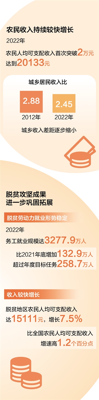 增加農(nóng)民收入是“三農(nóng)”工作的中心任務。2022年,農(nóng)民人均可支配收入首次突破2萬元,城鄉(xiāng)居民收入比從2012年的2.88下降到2022年的2.45,城鄉(xiāng)收入差距逐步縮小?!耙惨吹?,當前農(nóng)民收入增速有所放緩,增收動能有所減弱。必須高度重視,拿出長短結(jié)合、務實管用的硬措施,拓寬農(nóng)民增收致富渠道。”中央農(nóng)辦專職副主任、農(nóng)業(yè)農(nóng)村部黨組成員吳宏耀說。對此,今年中央一號文件在穩(wěn)定就業(yè)、經(jīng)營增效、挖潛財產(chǎn)收入以及拓展轉(zhuǎn)移收入等方面作出相關部署,努力讓農(nóng)民腰包越來越鼓,日子越過越紅火。