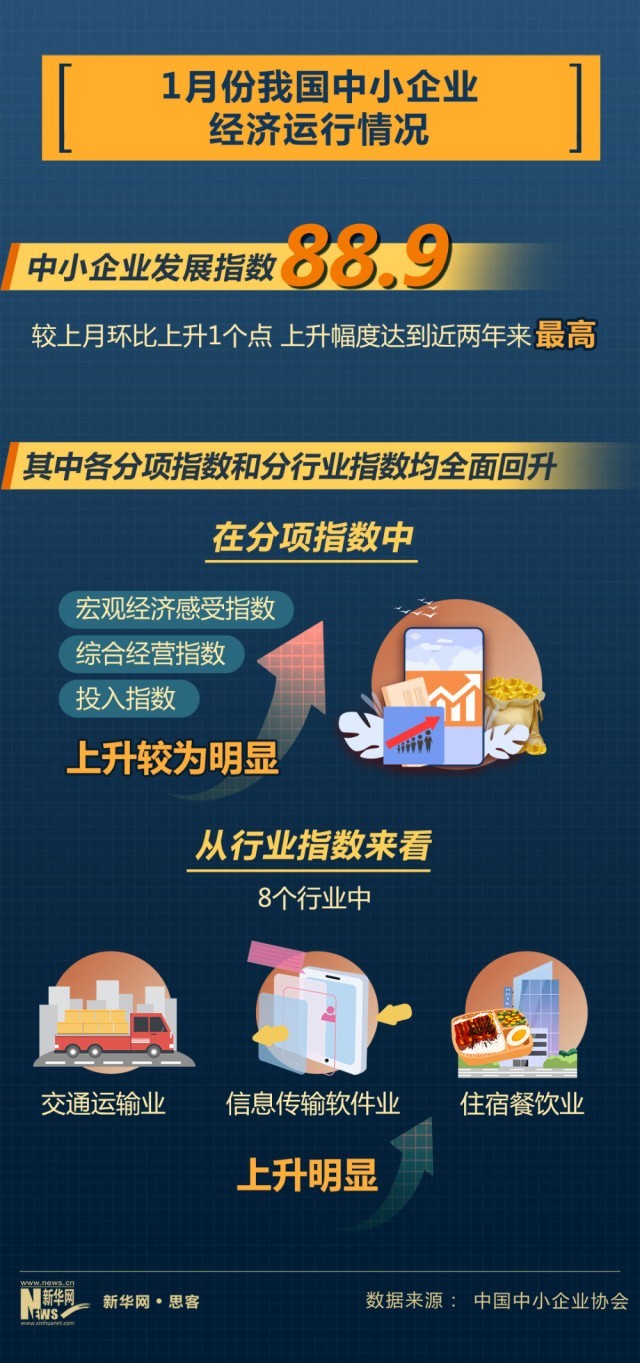 近日中國中小企業(yè)協(xié)會公布我國中小企業(yè)經(jīng)濟運行情況。2023年1月份,中國中小企業(yè)發(fā)展指數(shù)為88.9,比去年12月回升1個點,上升幅度達到近兩年來最高。其中,企業(yè)發(fā)展信心回升,反映企業(yè)信心狀況的宏觀經(jīng)濟感受指數(shù)為98.7,比上月上升2.1點。市場預期有所提振,市場指數(shù)為80.7,環(huán)比上升0.9點。