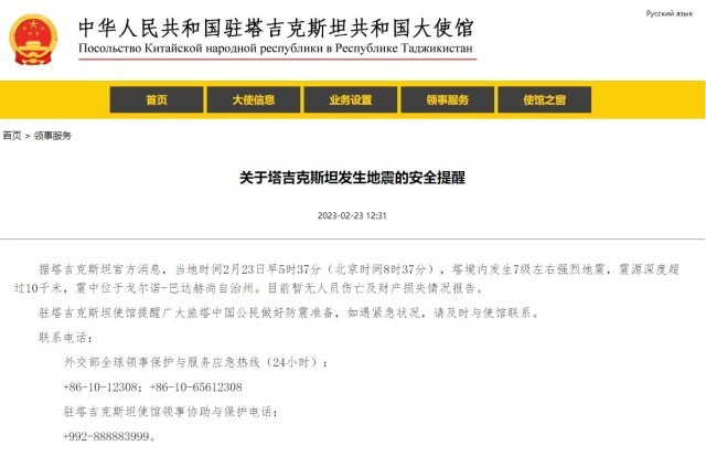 央視網(wǎng)消息:中國(guó)駐塔吉克斯坦大使館2月23日發(fā)布關(guān)于塔吉克斯坦發(fā)生地震的安全提醒。