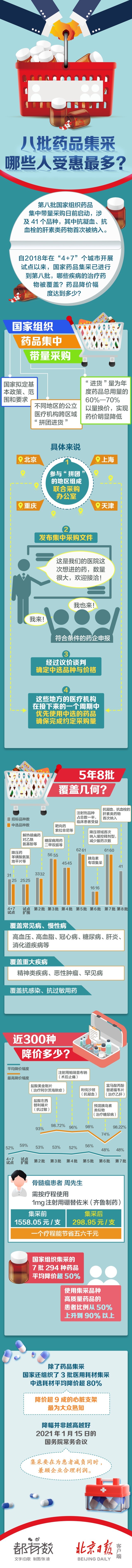 自2018年在“4+7”個(gè)城市開展試點(diǎn)以來,國家藥品集采已進(jìn)行到第八批,哪些疾病的治療藥物被覆蓋?藥品降價(jià)幅度達(dá)到多少?