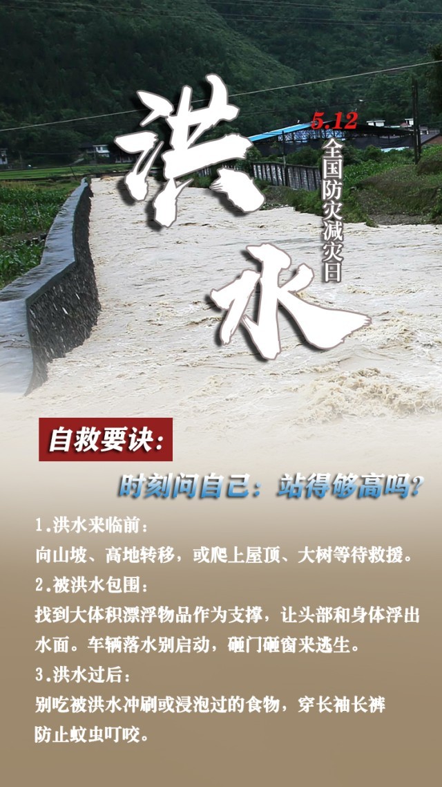 今天是第15個全國防災(zāi)減災(zāi)日。自然災(zāi)害隨時可能發(fā)生,及時自救才更有生存希望。地震來時,如何抓住12秒黃金逃生時間?發(fā)生火災(zāi)時,如何躲避火場濃煙?暴雨天如何安全出行?沙塵天氣如何做好防護……這份實用避險口訣簡單好記,請速速收藏。