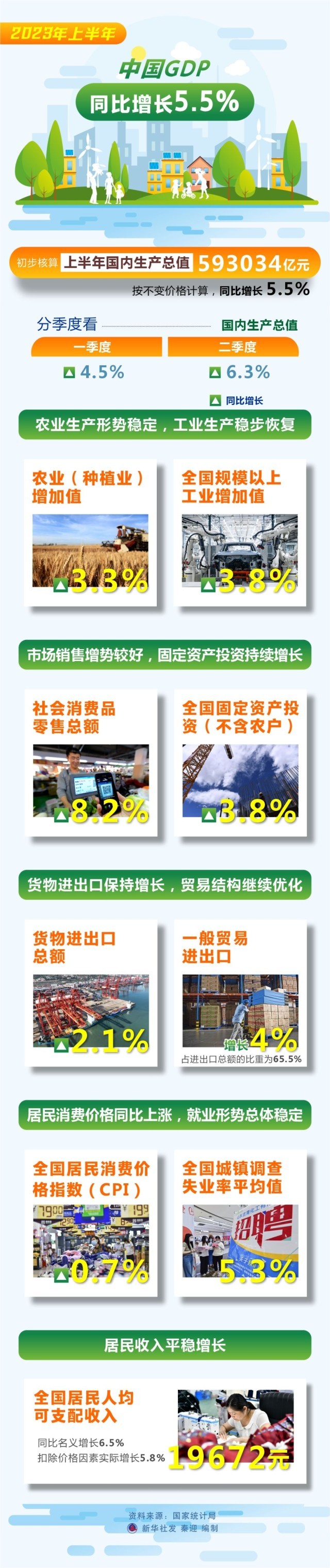 翻開半年報,國內(nèi)生產(chǎn)總值比去年同期增長5.5%,社會消費(fèi)品零售總額同比增長8.2%,第三產(chǎn)業(yè)增加值同比增長6.4%……多項指標(biāo)顯示,我國經(jīng)濟(jì)運(yùn)行延續(xù)恢復(fù)向好態(tài)勢,同時物價、出口等部分指標(biāo)增速放緩也引發(fā)關(guān)注。