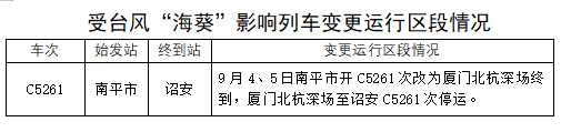 據(jù)中央氣象臺消息,今年第11號臺風(fēng)“??睂⒂?日凌晨到上午在福建漳浦至廣東惠來一帶沿海登陸,福建東部部分地區(qū)可能有大到暴雨,福建東南部部分地區(qū)有大暴雨,局地特大暴雨。為防范臺風(fēng)影響,保障運輸安全,中國鐵路南昌局集團(tuán)有限公司調(diào)整部分旅客列車運行方案,停運途經(jīng)杭深線管內(nèi)漳州(不含)至詔安區(qū)段旅客列車。
