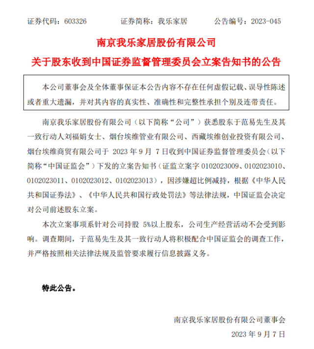 上市公司我樂家居今天(9月7日)公告,因涉嫌超比例減持,根據(jù)《中華人民共和國證券法》、《中華人民共和國行政處罰法》等法律法規(guī),中國證監(jiān)會決定對公司相關(guān)股東立案。