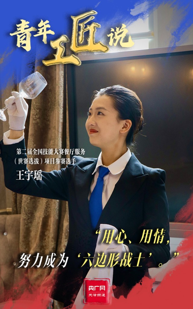 370余個(gè)考核點(diǎn),對(duì)于第二屆全國技能大賽餐廳服務(wù)(世賽選拔)項(xiàng)目參賽選手王宇瑤來說,有著巨大的考驗(yàn)。但面對(duì)困難,王宇瑤始終保持微笑,在老師的指導(dǎo)下練習(xí)調(diào)制雞尾酒、餐巾折花、餐桌擺盤成百上千次。整齊的著裝、得體大方的儀容、神采奕奕的狀態(tài),一顰一笑皆為王宇瑤的細(xì)心巧思?!拔覍⒁源舜伪荣悶槠鯔C(jī),努力磨煉技藝,成為一名全面發(fā)展的‘六邊形戰(zhàn)士’?!蓖跤瞵幮χf道。