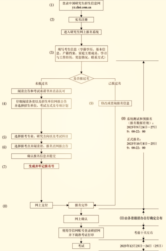 (1)考生應(yīng)在規(guī)定時(shí)間登錄“中國(guó)研究生招生信息網(wǎng)”(網(wǎng)址:https://yz.chsi.com.cn)瀏覽報(bào)考須知,并按省級(jí)教育招生考試機(jī)構(gòu)、報(bào)考點(diǎn)以及報(bào)考招生單位的網(wǎng)上公告要求報(bào)名;