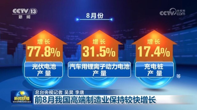 8月份,主要新能源產(chǎn)品兩位數(shù)增長(zhǎng),新能源汽車產(chǎn)量同比增長(zhǎng)13.8%,帶動(dòng)光伏電池、汽車用鋰離子動(dòng)力電池、充電樁等產(chǎn)品產(chǎn)量分別增長(zhǎng)77.8%、31.5%、17.4%;新材料產(chǎn)品生產(chǎn)保持高速增長(zhǎng),太陽能工業(yè)用超白玻璃、多晶硅、單晶硅等產(chǎn)品產(chǎn)量分別增長(zhǎng)63.3%、84.6%、79.9%。