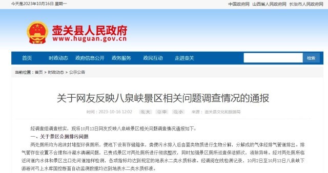 據(jù)壺關(guān)縣政府網(wǎng)站10月16日援引壺關(guān)縣文化和旅游局消息,經(jīng)調(diào)查組調(diào)查核實,現(xiàn)將10月13日網(wǎng)友反映八泉峽景區(qū)相關(guān)問題調(diào)查情況通報如下: