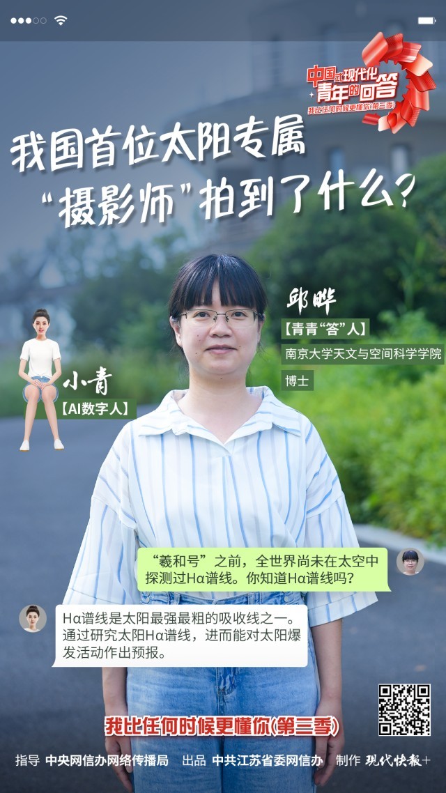 11月7日,“中國式現代化·青年的回答——我比任何時候更懂你(第三季)”系列短視頻之《我國首位太陽專屬“攝影師”拍到了什么?》正式上線。本集視頻中,青青“答”人——南京大學天文與空間科學學院博士邱曄和AI數字人小青,為大家展示了我國首顆探日衛(wèi)星“羲和號”拍攝到的畫面,解釋了“羲和號”超長全稱里的兩個關鍵詞的含義。