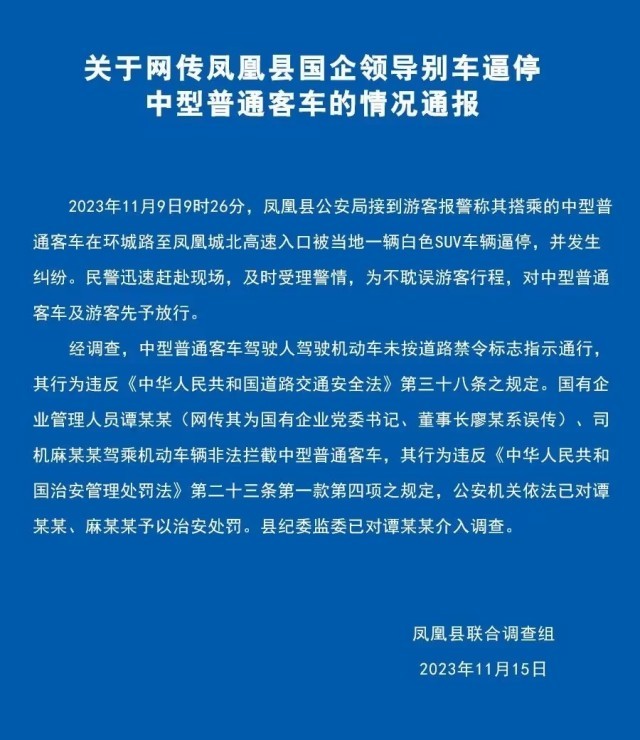 央視網(wǎng)消息:據(jù)鳳凰融媒微信公眾號(hào)消息,11月15日,鳳凰縣聯(lián)合調(diào)查組發(fā)布情況通報(bào),經(jīng)調(diào)查,中型普通客車駕駛?cè)笋{駛機(jī)動(dòng)車未按道路禁令標(biāo)志指示通行,其行為違反相關(guān)規(guī)定。國有企業(yè)管理人員譚某某 (網(wǎng)傳其為國有企業(yè)黨委書記、董事長廖某系誤傳)、司機(jī)麻某某駕乘機(jī)動(dòng)車輛非法攔截中型普通客車,其行為違反相關(guān)規(guī)定,公安機(jī)關(guān)依法已對(duì)譚某某、麻某某予以治安處罰??h紀(jì)委監(jiān)委已對(duì)譚某某介入調(diào)查。