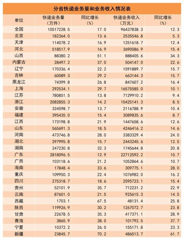 1-10月,同城快遞業(yè)務量累計完成108.3億件,同比增長2.7%;異地快遞業(yè)務量累計完成919.2億件,同比增長18.2%;國際/港澳臺快遞業(yè)務量累計完成24.2億件,同比增長55.1%。