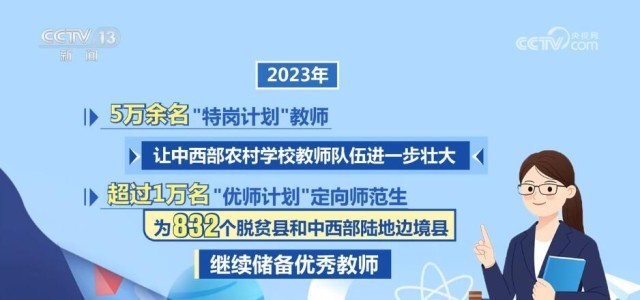 強(qiáng)教必先強(qiáng)師。2023年,5萬余名“特崗計(jì)劃”教師讓中西部農(nóng)村學(xué)校教師隊(duì)伍進(jìn)一步壯大,超過1萬名“優(yōu)師計(jì)劃”定向師范生為832個(gè)脫貧縣和中西部陸地邊境縣繼續(xù)儲(chǔ)備優(yōu)秀教師。