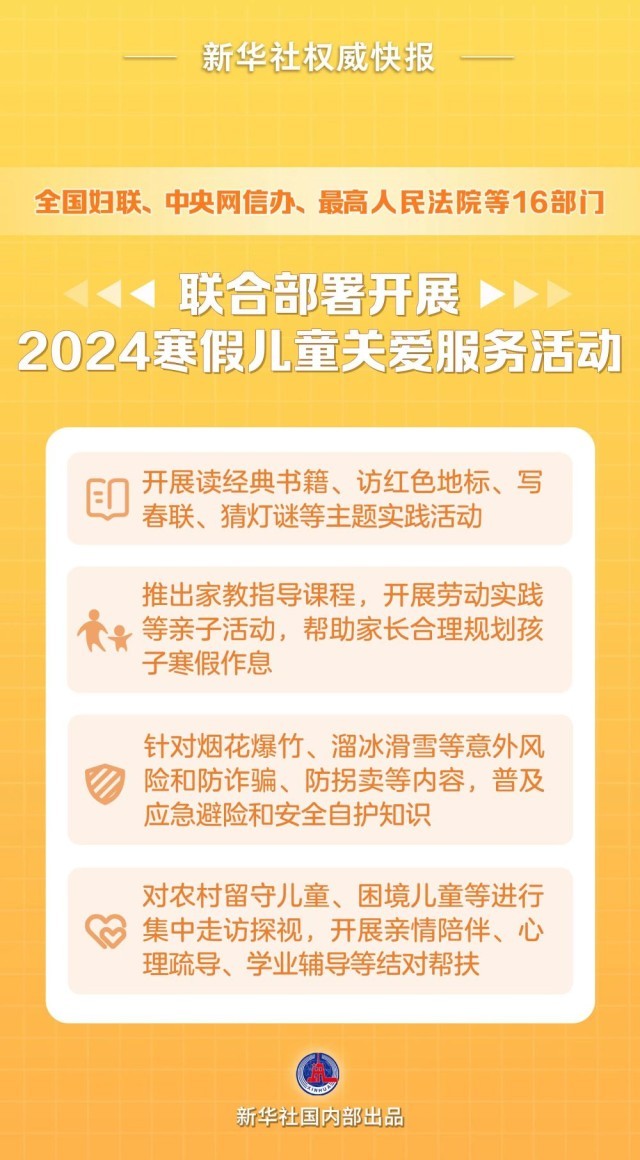 寒假即將到來,全國婦聯(lián)、中央網(wǎng)信辦、最高人民法院、最高人民檢察院、教育部、公安部、民政部、司法部、國家衛(wèi)生健康委、應(yīng)急管理部、國家體育總局、國家疾控局、國家消防救援局、全國總工會(huì)、共青團(tuán)中央、中國關(guān)工委等16部門印發(fā)通知,圍繞思想引領(lǐng)潤童心、家教指導(dǎo)育童心、安全教育護(hù)童心、愛心媽媽暖童心四個(gè)方面,聯(lián)合部署開展“把愛帶回家——真情暖童心 相伴護(hù)成長”2024寒假兒童關(guān)愛服務(wù)活動(dòng)。