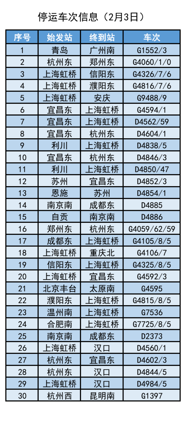 截至2月3日7時30分,計(jì)劃停運(yùn)2月3日至2月4日間39趟旅客列車。