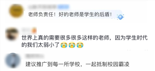 這位老師的做法,贏得了眾多網(wǎng)友的點(diǎn)贊:“好老師是學(xué)生的后盾”“一起抵制校園霸凌”。