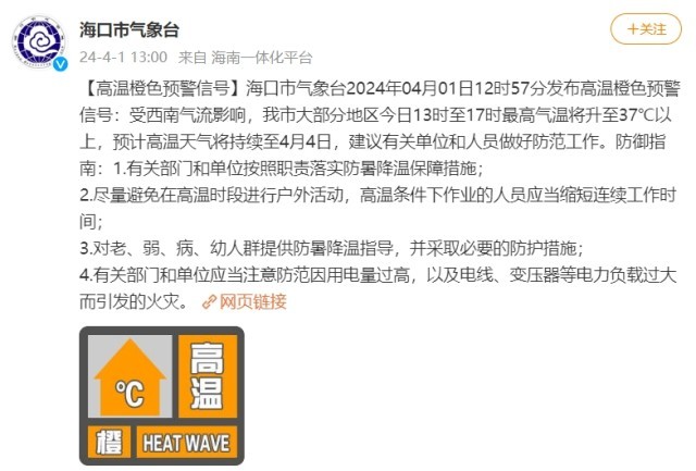 央視網(wǎng)消息:據(jù)@海口市氣象臺 微博消息,??谑袣庀笈_2024年04月01日12時57分發(fā)布高溫橙色預(yù)警信號:受西南氣流影響,海口市大部分地區(qū)今日13時至17時最高氣溫將升至37℃以上,預(yù)計(jì)高溫天氣將持續(xù)至4月4日,建議有關(guān)單位和人員做好防范工作。