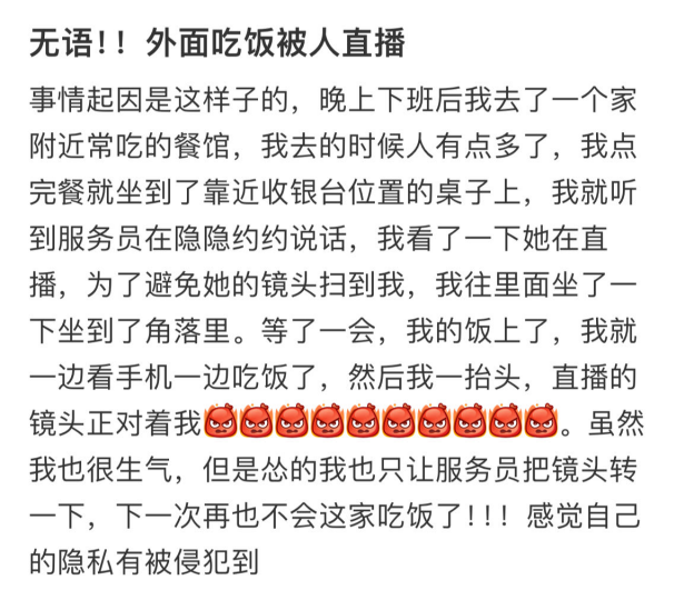 據(jù)媒體報(bào)道,近期,陜西西安兩名老人用餐時(shí)被商家拍下視頻,之后商家又私自將拍攝內(nèi)容發(fā)到網(wǎng)上,老人親戚無(wú)意刷到視頻才發(fā)現(xiàn)。在老人家屬與其多次溝通后,商家刪除了視頻。消費(fèi)者多在不知情或者未被征詢意見的情況下被動(dòng)充當(dāng)商家直播或者拍攝短視頻的引流工具,除了自己的言行舉止可能被迫接受他人的凝視和審判外,還有面部信息泄露風(fēng)險(xiǎn)。
