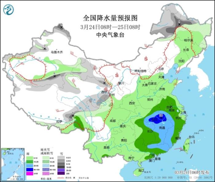 圖2 全國降水量預(yù)報圖(3月24日08時-25日08時)