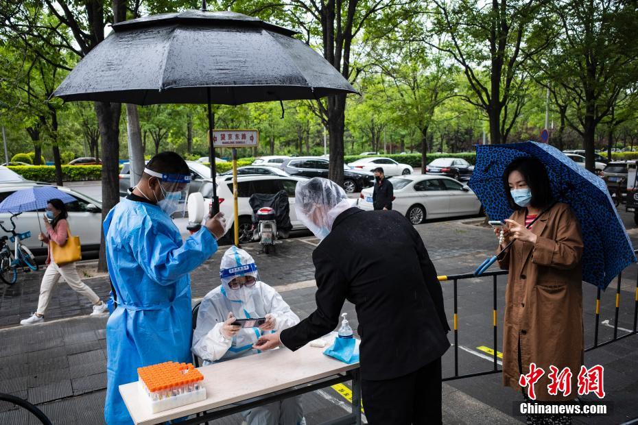 4月27日,生活、工作在北京市朝陽區(qū)的民眾冒雨參加第二次常態(tài)化核酸檢測。朝陽區(qū)已于4月25日進(jìn)行了首次常態(tài)化核酸檢測,4月29日還將進(jìn)行第三次。圖為一位男士在核酸檢測點信息登記處登記信息。 中新社記者 侯宇 攝