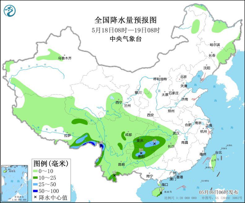 5月18日08時至19日08時,貴州大部、重慶南部、湖南西部、云南南部和西部、海南島東南部、西藏東南部等地部分地區(qū)有中到大雨,其中,西藏東南部、云南西北部等地部分地區(qū)有暴雨(50~65毫米)。黃淮東部、遼東半島等地部分地區(qū)有4~5級風(fēng)。