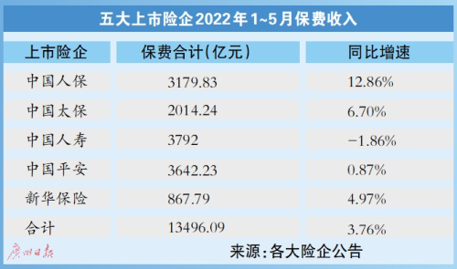 截至6月15日,A股包括中國人壽、中國平安、中國人保等在內(nèi)的五大上市險企今年前5個月的保費收入全部出爐,合計取得保費收入約1.35萬億元,同比增長3.76%。