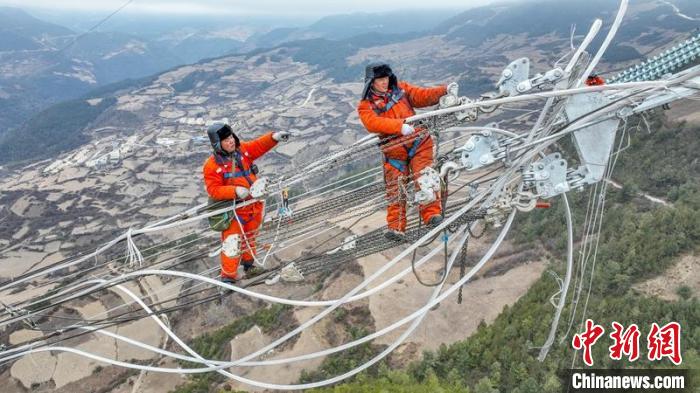 電力工人曾坤銀和熊志偉正在進(jìn)行高空作業(yè)。 盧忠東 攝