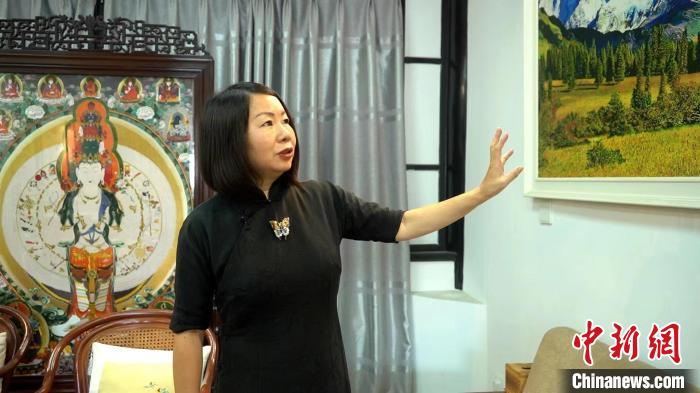 孟德芝正在介紹蜀繡作品?!√茊⒑?攝
