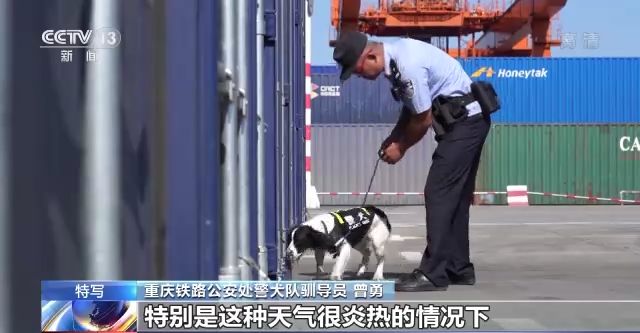 重慶鐵路公安處警犬隊馴導(dǎo)員 陳城:咱們警犬它散熱的方式就是通過舌頭,但是它工作的時候又要閉著嘴,用鼻子來呼吸、工作。天氣又太熱,它自身也非常難受,其實它內(nèi)心是非常煎熬的,但是咱們的警犬都非常棒,執(zhí)行命令也非常強(qiáng)。