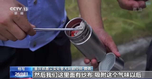 重慶鐵路公安處警犬隊馴導(dǎo)員 曾勇:這是我們訓(xùn)練用的乳化炸藥,然后我們這里面有紗布,吸附這個氣味后,就可以放在箱子里面,然后讓搜爆犬來進(jìn)行搜尋。如果它坐下或者臥下示警的話,就表示這個箱子里有危險品。