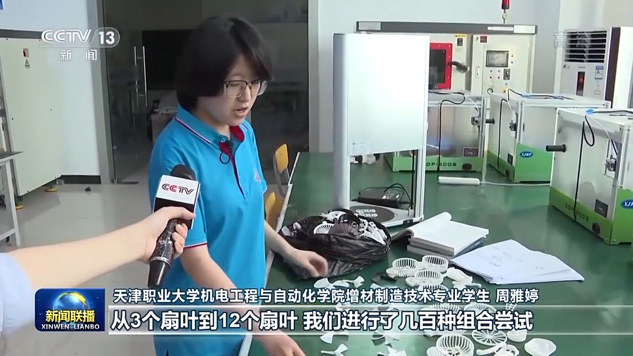 天津職業(yè)大學(xué)機(jī)電工程與自動(dòng)化學(xué)院增材制造技術(shù)專(zhuān)業(yè)學(xué)生 周雅婷:這些都是我們通過(guò)3D打印打印出來(lái)的,從3個(gè)扇葉到12個(gè)扇葉,我們進(jìn)行了幾百種組合嘗試。如果差0.1毫米的話(huà),可能會(huì)導(dǎo)致風(fēng)扇卡住。
