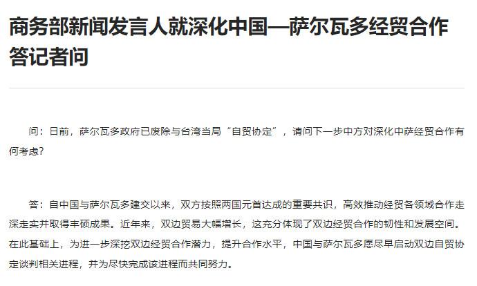 商務部新聞發(fā)言人就深化中國—薩爾瓦多經(jīng)貿(mào)合作答記者問