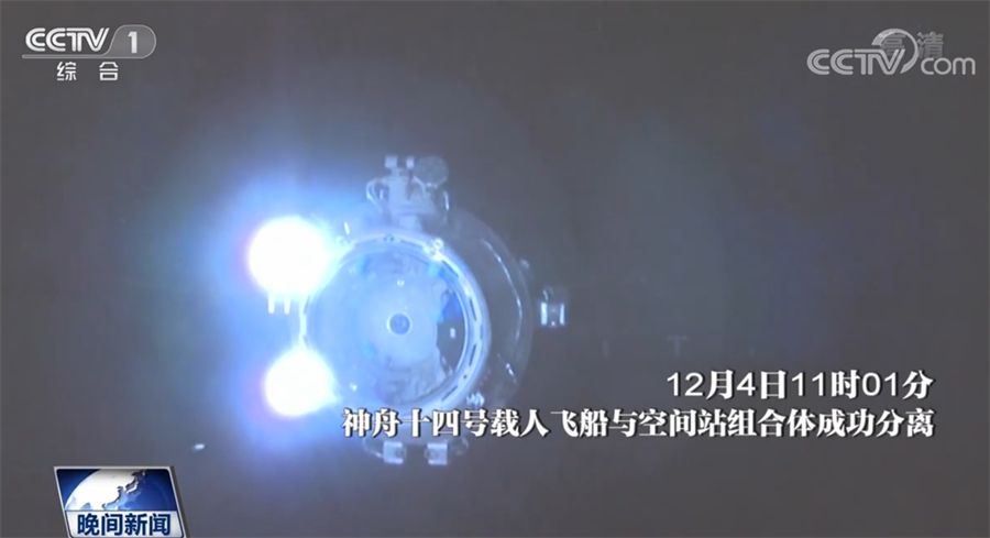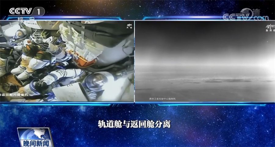 19時(shí)20分,北京航天飛行控制中心通過地面測(cè)控站發(fā)出返回指令,神舟十四號(hào)載人飛船軌道艙與返回艙成功分離。此后,飛船返回制動(dòng)發(fā)動(dòng)機(jī)點(diǎn)火,返回艙與推進(jìn)艙分離。