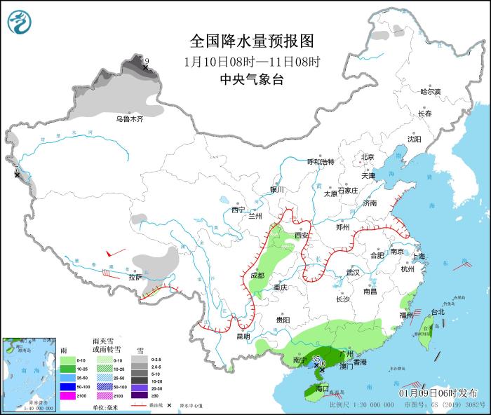 圖1 全國降水量預(yù)報圖(1月9日08時-10日08時)