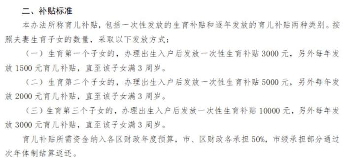 辦法擬規(guī)定,按照夫妻生育子女的數量,發(fā)放育兒補貼。其中,生育第一個子女的,辦理出生入戶后發(fā)放一次性生育補貼3000元,另外每年發(fā)放1500元育兒補貼,直至該子女滿3周歲;生育第二個子女的,辦理出生入戶后發(fā)放一次性生育補貼5000元,另外每年發(fā)放2000元育兒補貼,直至該子女滿3周歲;生育第三個子女的,辦理出生入戶后發(fā)放一次性生育補貼10000元,另外每年發(fā)放3000元育兒補貼,直至該子女滿3周歲。育兒補貼所需資金納入各區(qū)財政年度預算,市、區(qū)財政各承擔50%,市級承擔部分通過次年體制結算返還。(中新財經)